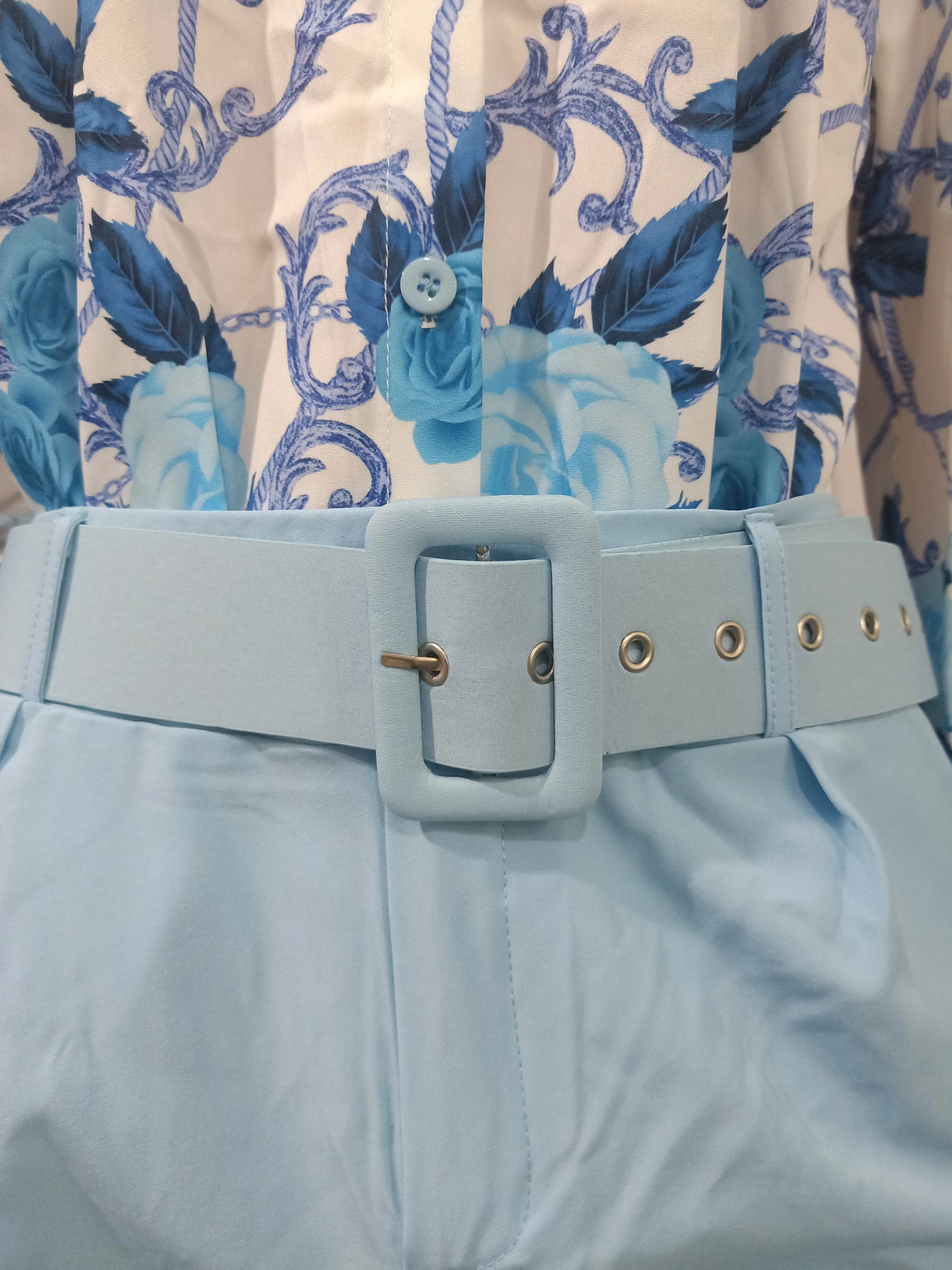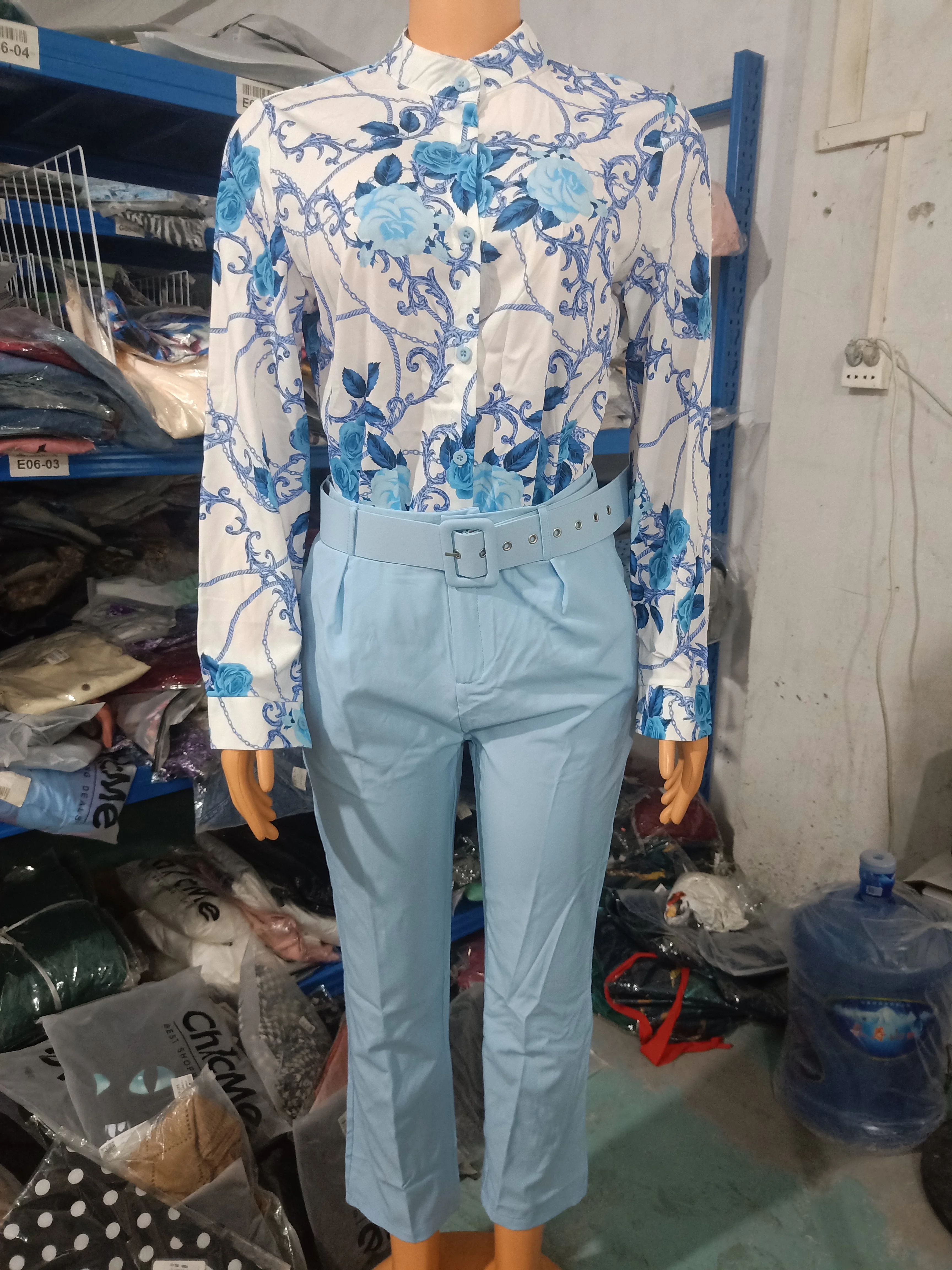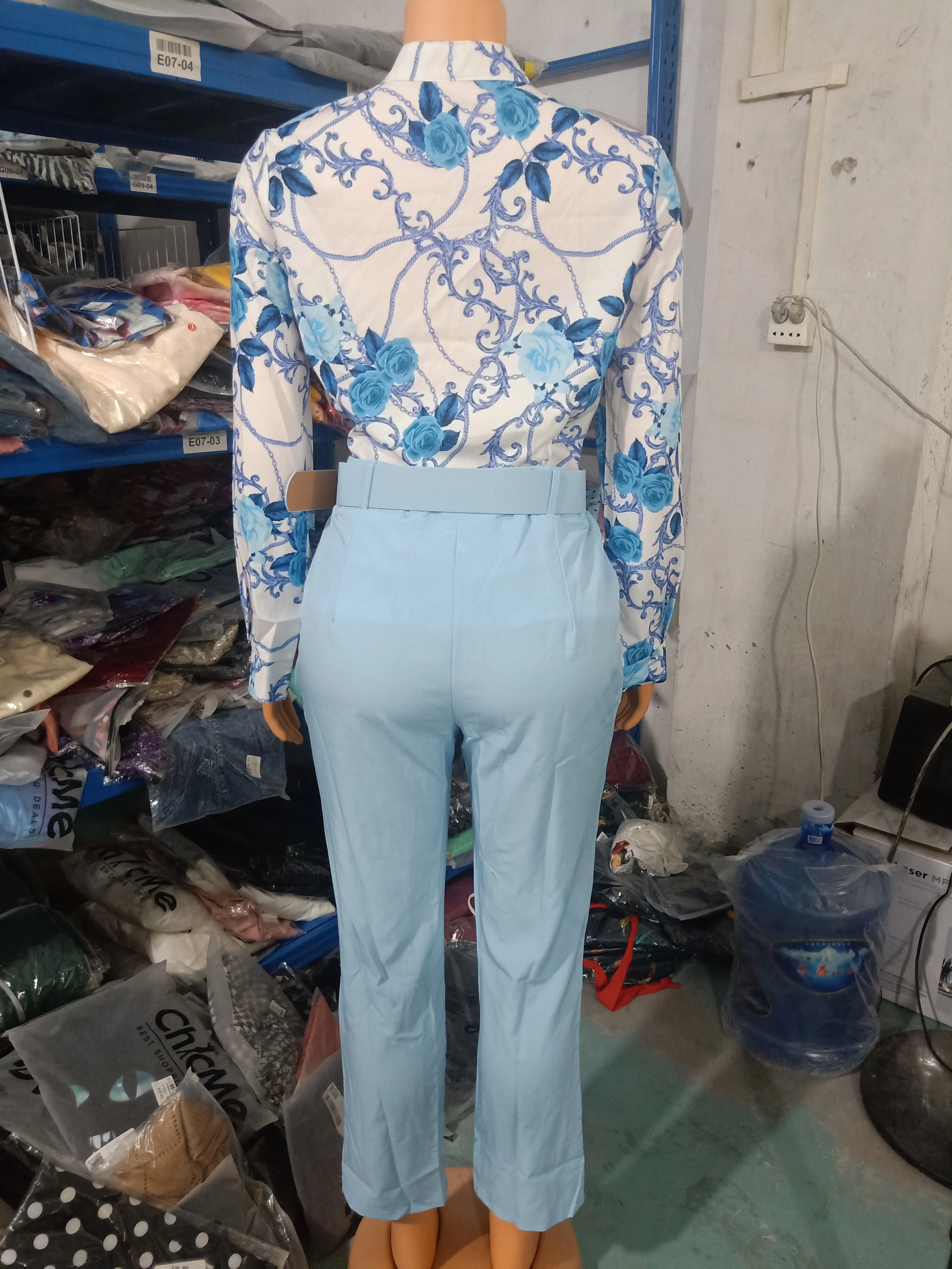 Two Piece Sets Womens Outifits 2023 Spring Fashion Print Turn-Down Collar Long Sleeve Top & Casual Solid Color Long Pants Set